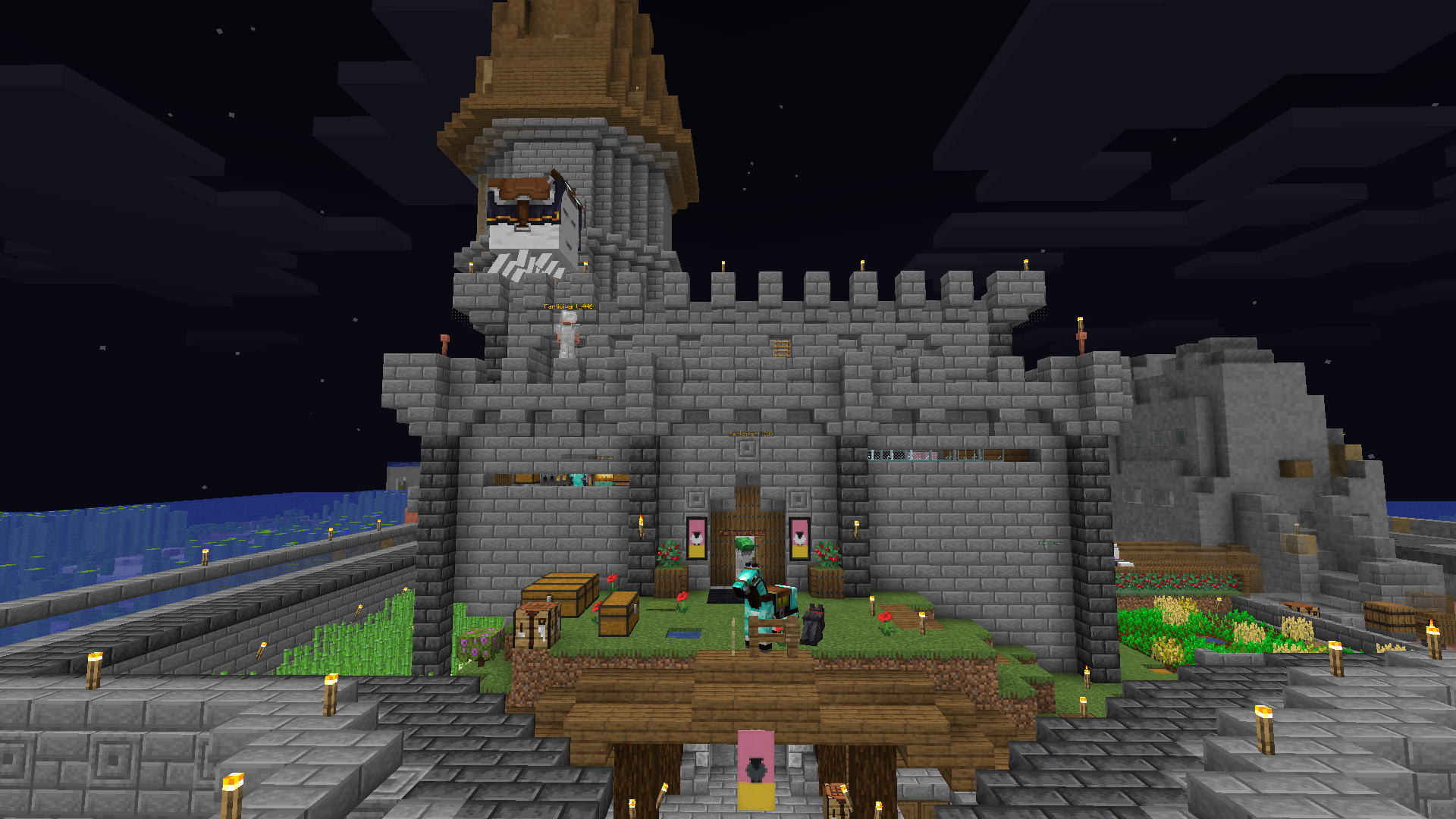 Initially starting as a crude skybase, the castle of Black Sheep Island expanded, eventually touching the ground and growing towers, skyports, and common rooms like the bar. Black Sheep Island later expanded to gain a separate smithing tower, as well as a neighboring island used mainly for agriculture and turtle love.
