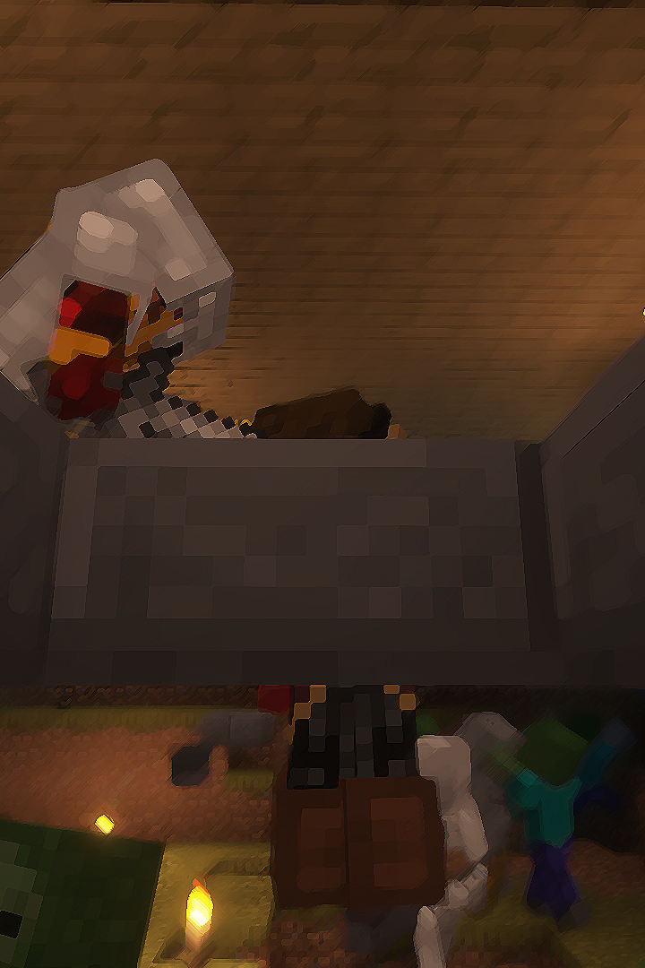 The illustration captures Goggles (53) stepping into a hole mined by Trout (461), unaware of the danger due to server lag. | Goggles is shown plummeting into the depths under Bunker, surrounded by undead, while Trout peers down with sword in hand |