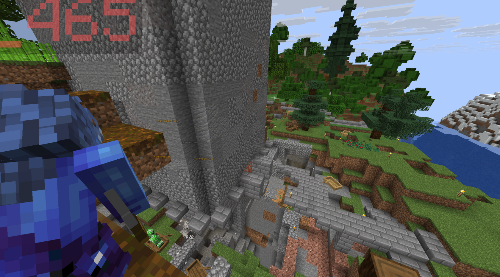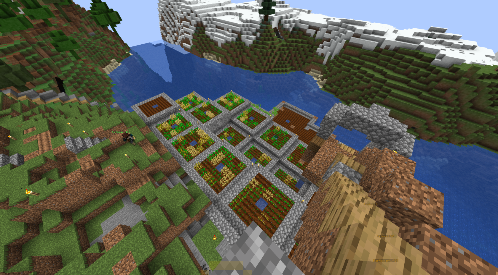 The farmers grow wheat on stone terraces along the riverside, which feeds sheep and cows. Above it is a Sugarcane Farm, attached to the citadel. Enough food is produced to sustain Pitsberg's burgeoning population without the need for rationing. Builders are constantly constructing additions and reinforcing the growing settlement, preventing the constant onslaught of mobs from assailing its inhabitants.