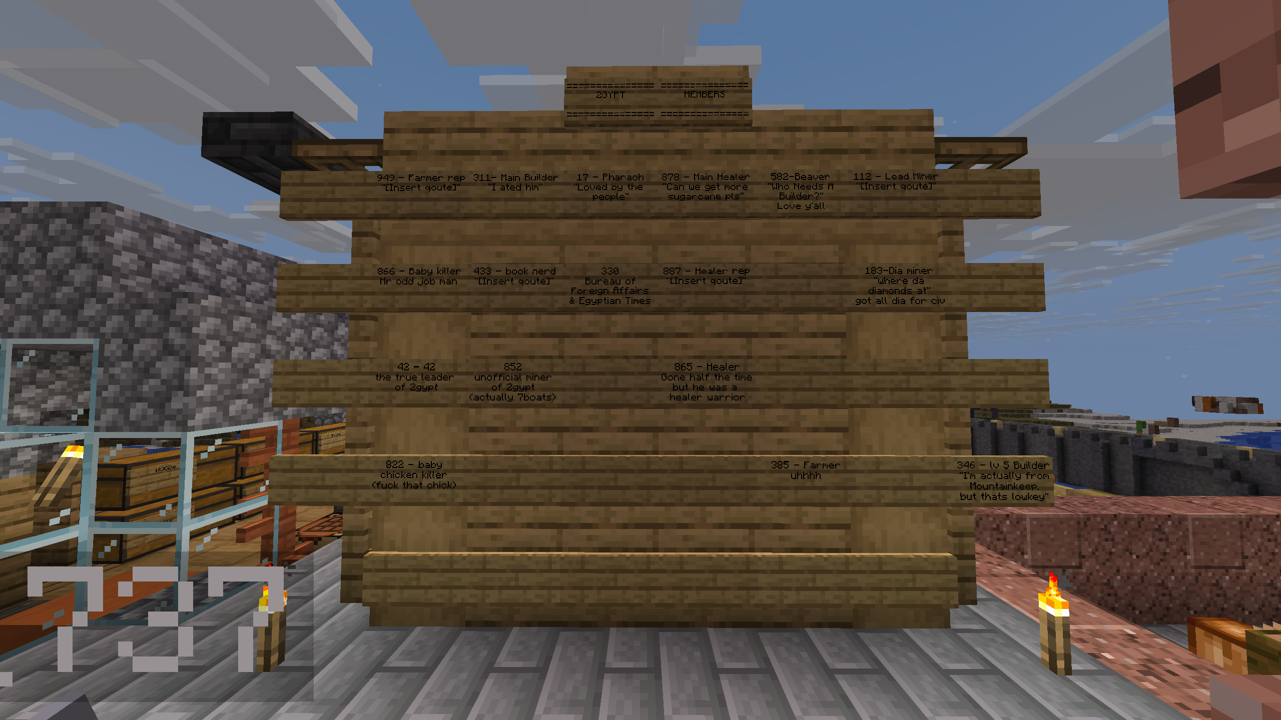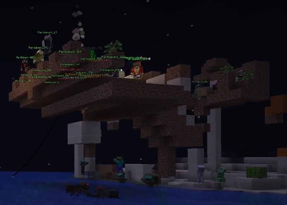 The March from the Desert: A massive group of ~35 players gathered on a sky base near the desert spawn. Player 17, seeing the chaos, took control of the food supply by crafting a campfire. People described it as him "graciously sharing it with the starving masses."