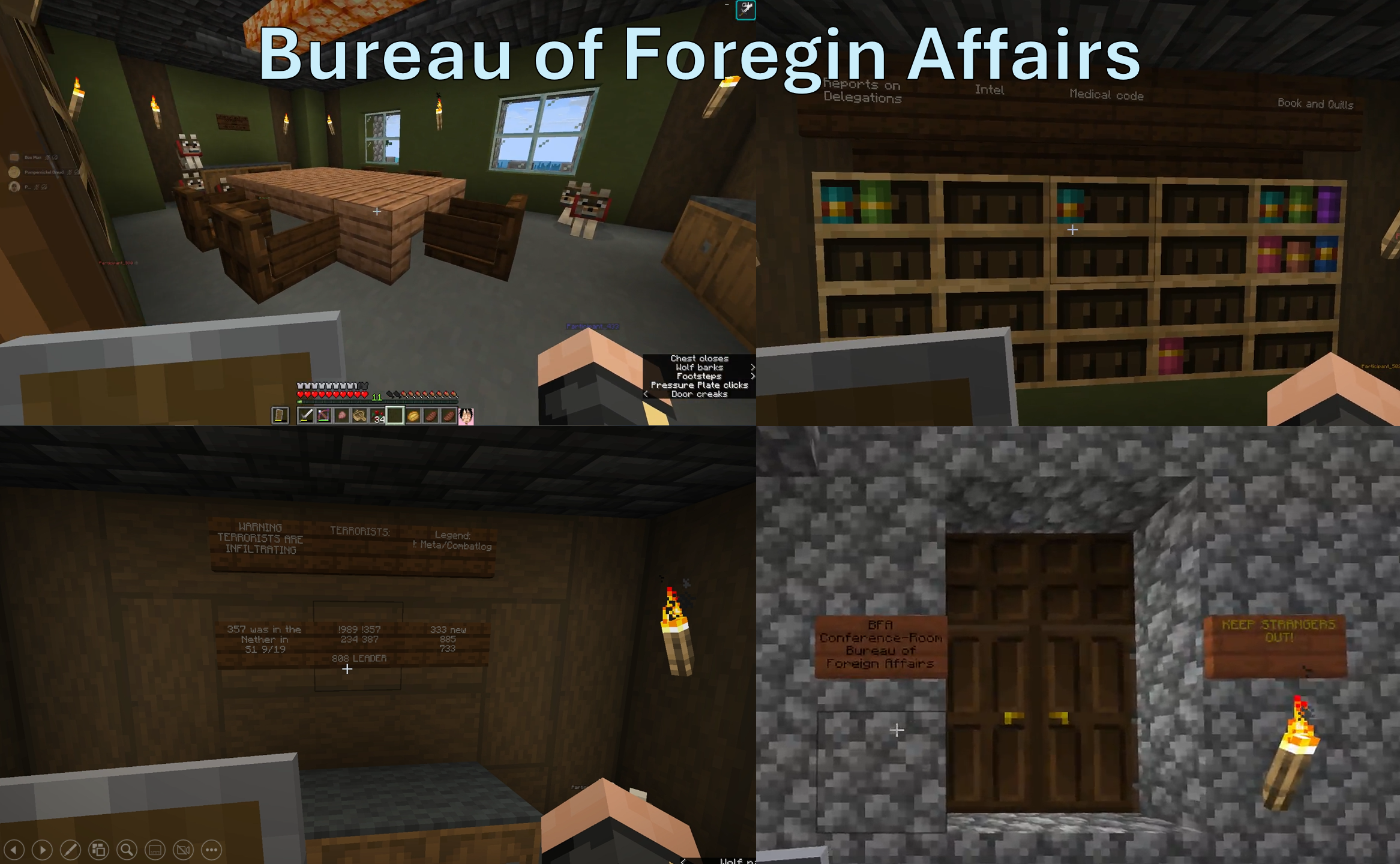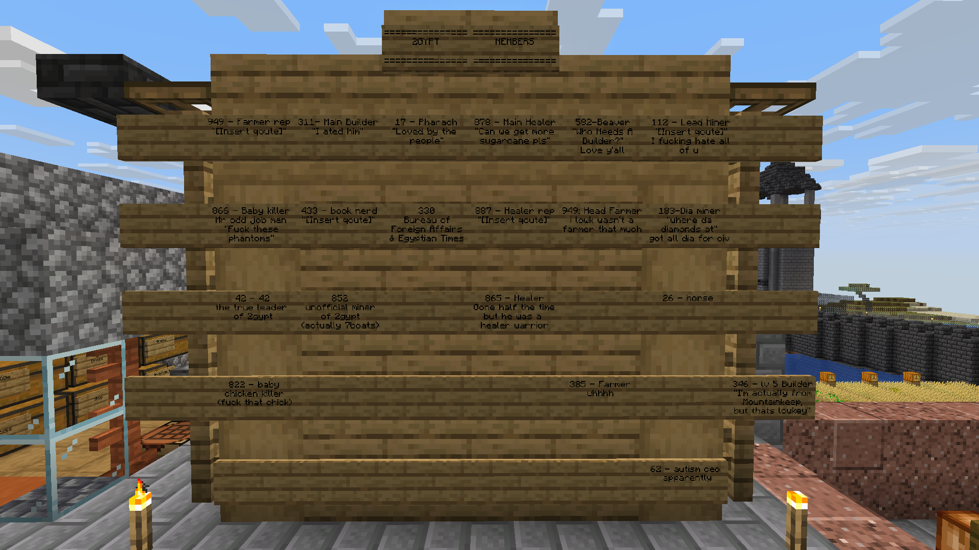 The World Tour and Late-Game Diplomacy: In the final sessions, with no major threats remaining, Twogypt hosted "The Great World Tour," (or its alternative name "The Rapture Tour") a peaceful expedition where they visited nearly every known civilization, documenting their findings on the wiki. After every base tour, Player 183 donated vast amounts of minerals to each civilization, most notably 4 out of the 6 diamond blocks Twogypt had in their reserves. This act showed the world the deep kindness of the people of Twogypt. Player vael7176 documented this tour, showcasing their builds and interactions.