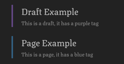 To make a draft, click the "New Page" button as you normally would. This new page stays as a draft until it is saved as a page, and will have a purple tag when viewed from the book (as seen below). Drafts also won't make a wiki-log when saving, so if you aren't sure if your page is a draft you can go to #wiki-log in the discord server and check to see if there is a log. No log = page is still a draft.