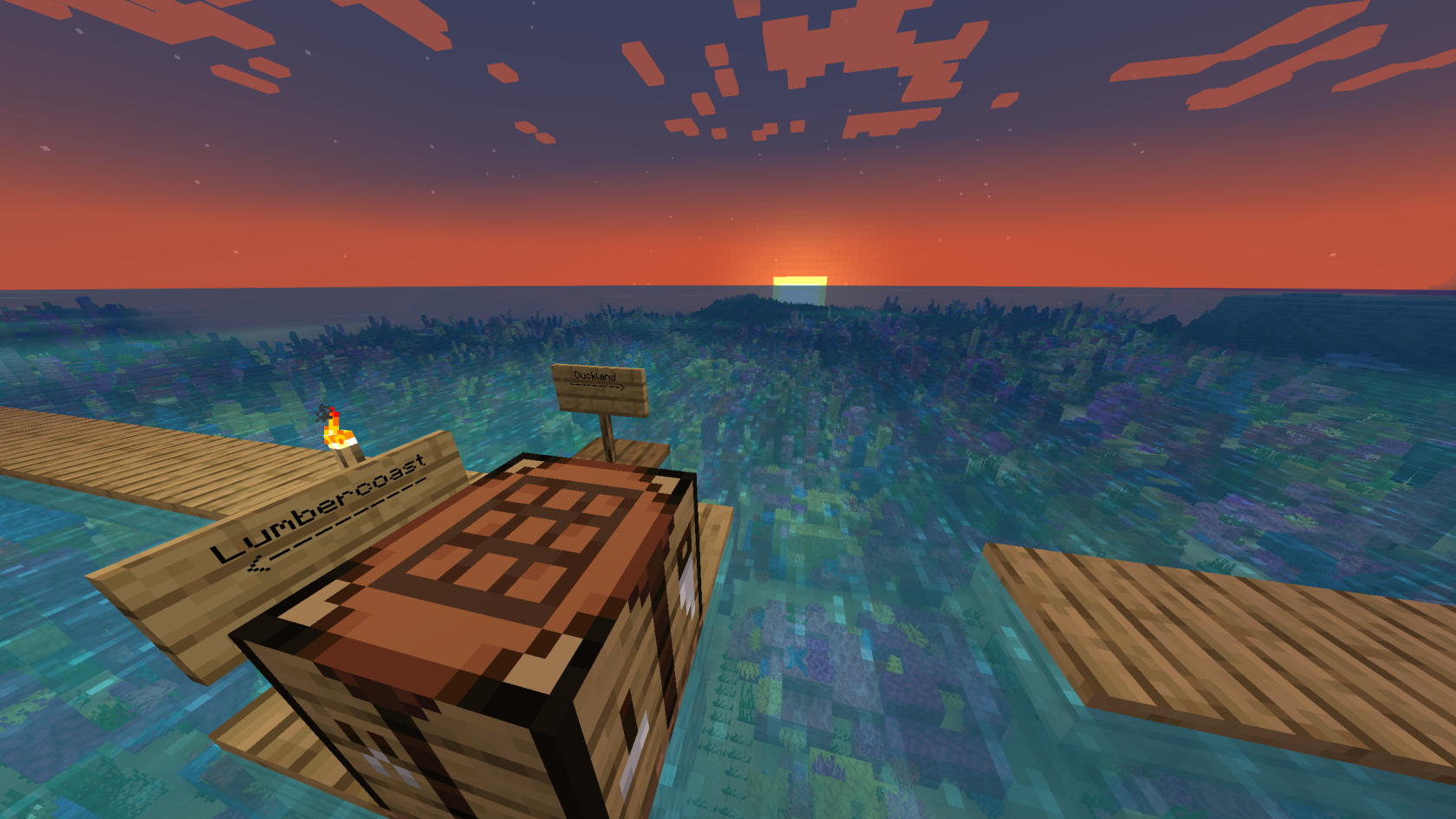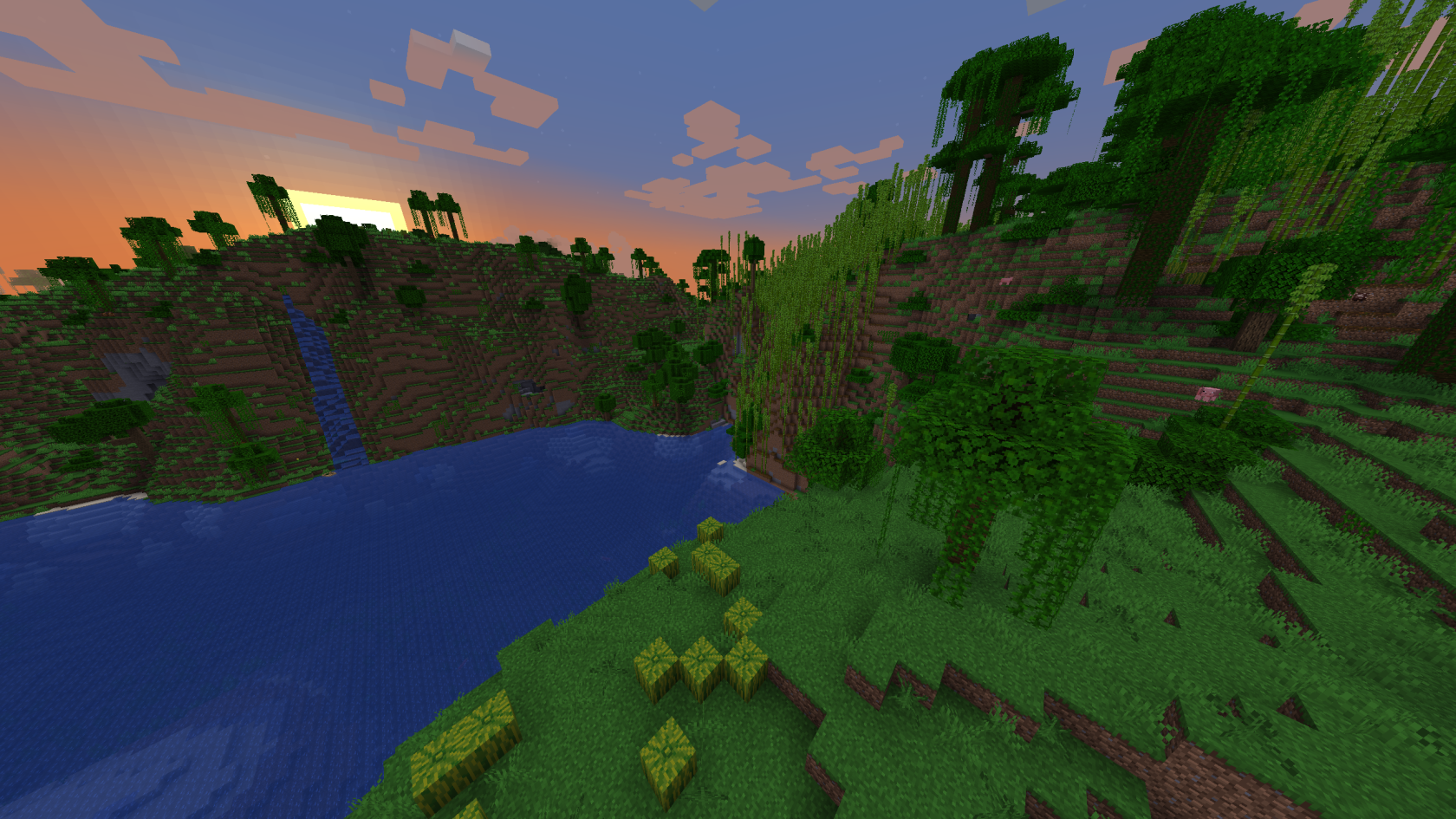 North of the Central Sea lies the lush coastline and dense interior of the jungle biome. A plethora of settlements/nations have formed in this region due to the abundance of resources. The waterfront extends both further north into the Jungle Gulf between Madagascar and Duckland and eastward into a lagoon housing smaller states like Elpida and Sanctuary. The shoreline itself is mostly clear and level due to player activity removing trees and flattening farmland, whilst the interior forest is still densely wooded with natural food sources like cocoa and melon. Due to the distance from world spawn, the strength of hostile mobs in the Jungle is higher and they pose a significant threat in dark areas. Wildlife include cows, pigs, parrots, chicken, and elusive ocelot.