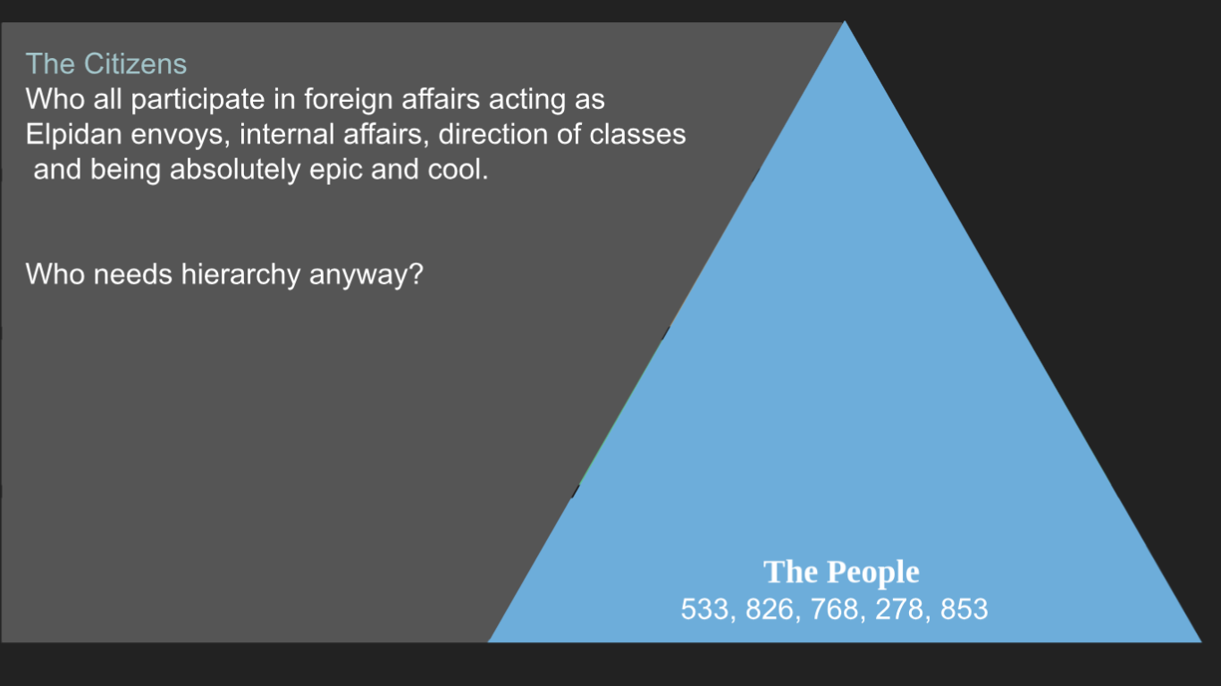 Each citizen has the power to vote on every major decision, and most minor decisions are made by mutual agreement. Citizens themselves are able to act mostly independently, short of committing actions that would upset other nations.