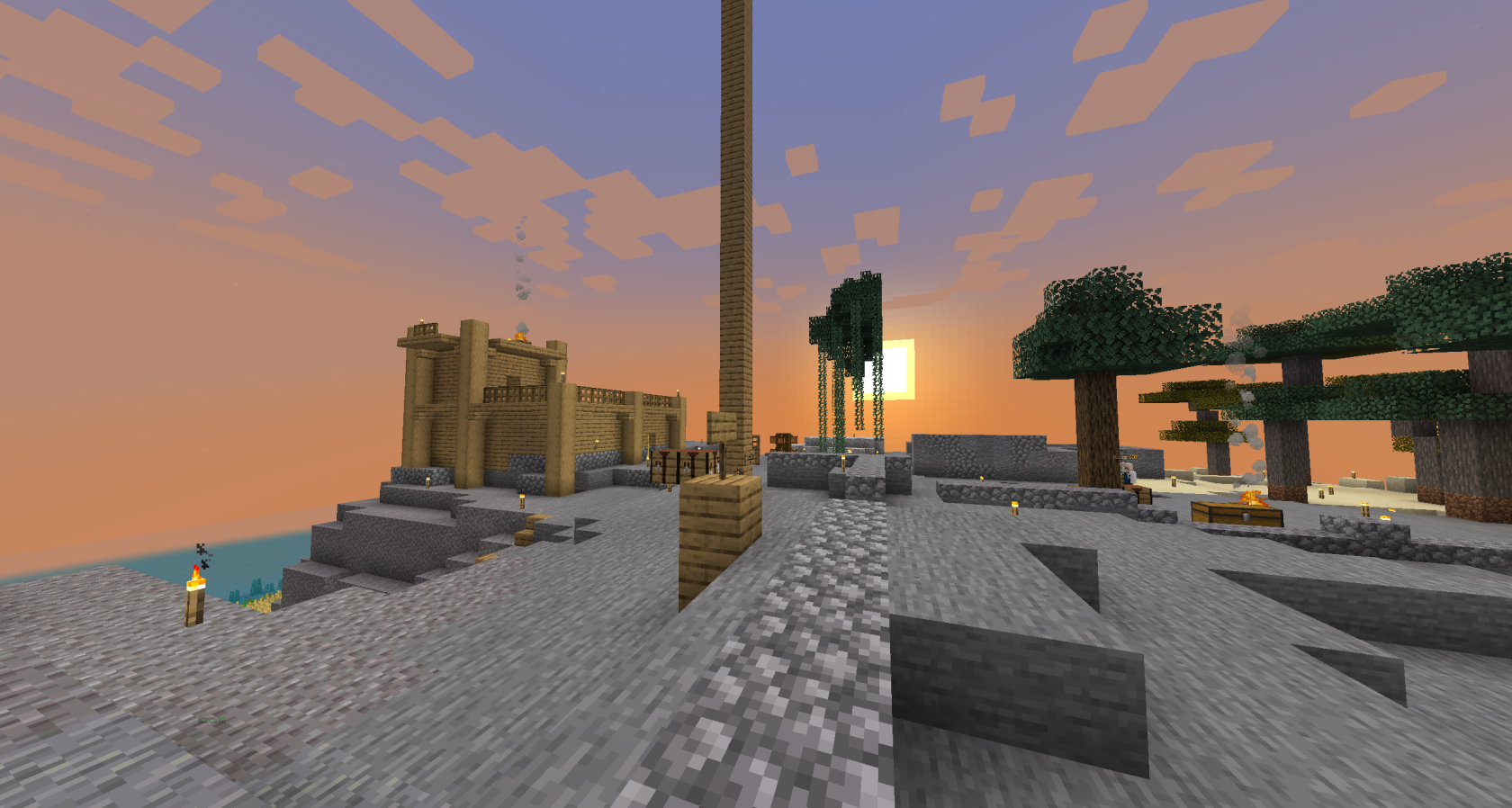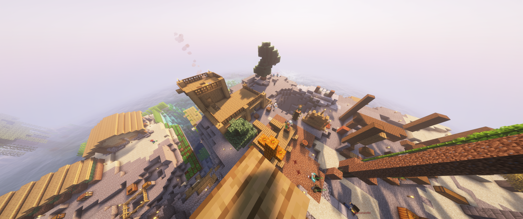 In the chaotic finale of session 14, Lumber Coast somehow weathered the constant ransacking, arson, and murders through the tireless efforts of 679, 436, and 206 repairing damages and fending off waves of better-equipped terrorists. Eventually, as spawn points were demolished across the world, many respawning refugees made their way to Lumber Coast and gathered for the final moments of the trial. Player 445 and 259 brought an eclectic assortment of treasures and gear from their journeys that session to visit each nation amidst the chaos, and these treasures were split among the players at a banquet table.