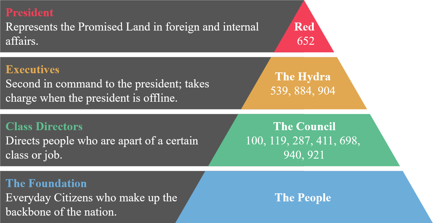 The Promised Land is a Presidential Republic and has 1 main Leader called "The Mayor" and then has Leaders of guilds under him who control each branch of jobs. There are also 2 Sub Leaders under the mayor that are there for backup if the mayor isn't available. An infographic of the class hierarchy is shown below: