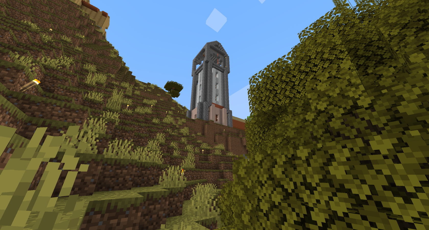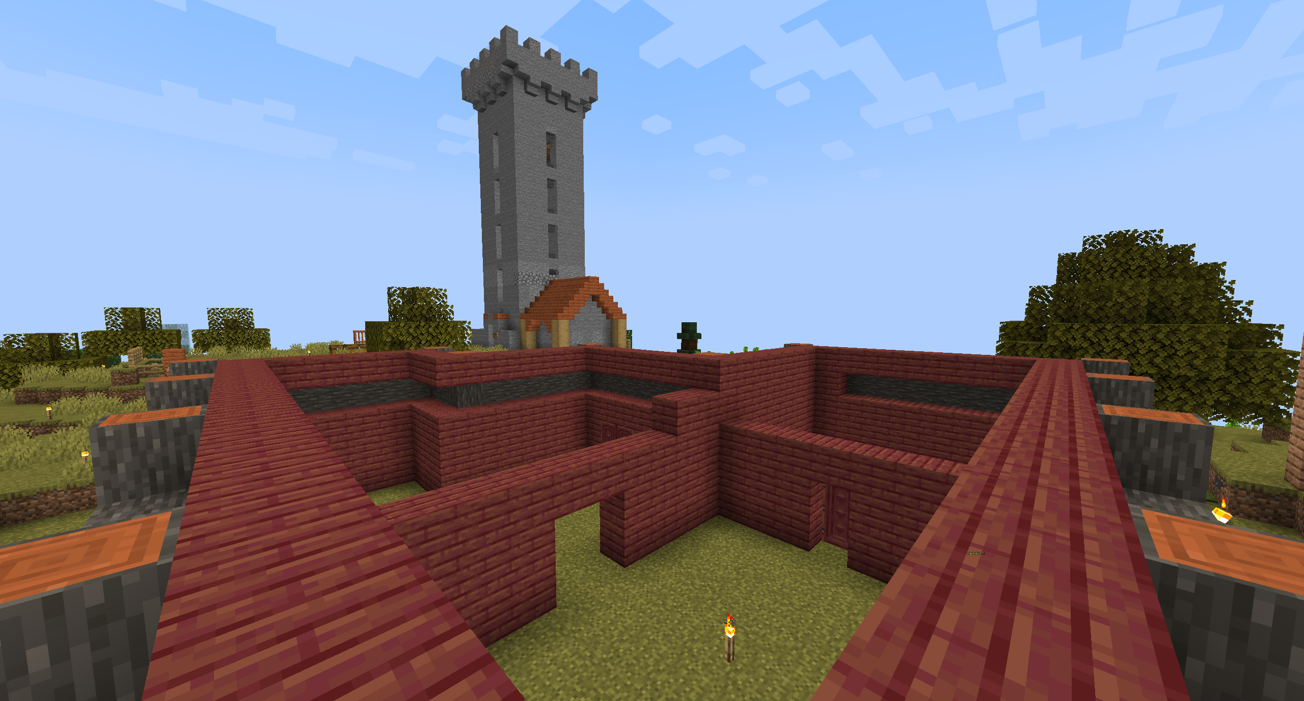 The tower below has a surprising amount of history behind it. Originally, it acted as the home of player 244, known as the 'propaganda guy'. The tower even featured a sign on the front naming it as 'The Propaganda Mill'. Later on however, during a session in which 244 could not play, with the assumption that the tower was abandoned the trial of 'The heretic' was held there. And when they were found guilty, the tower was sealed off with cobblestone to keep the heretic inside. When 244 next logged on he was naturally quite confused having found his home covered in cobblestone. This was the same session where -due to a change to the plugin- tools took up to thirty seconds to break stone. 244 assumed the cobblestone was some sort of griefing so went about removing it. Slowly. When the sealing stone had all been removed it was then that the heretic logged back in and walked out the tower to find 244 standing there confused. 244 killed the heretic on the spot. The heretic was later seen that same session in Madagascar.
