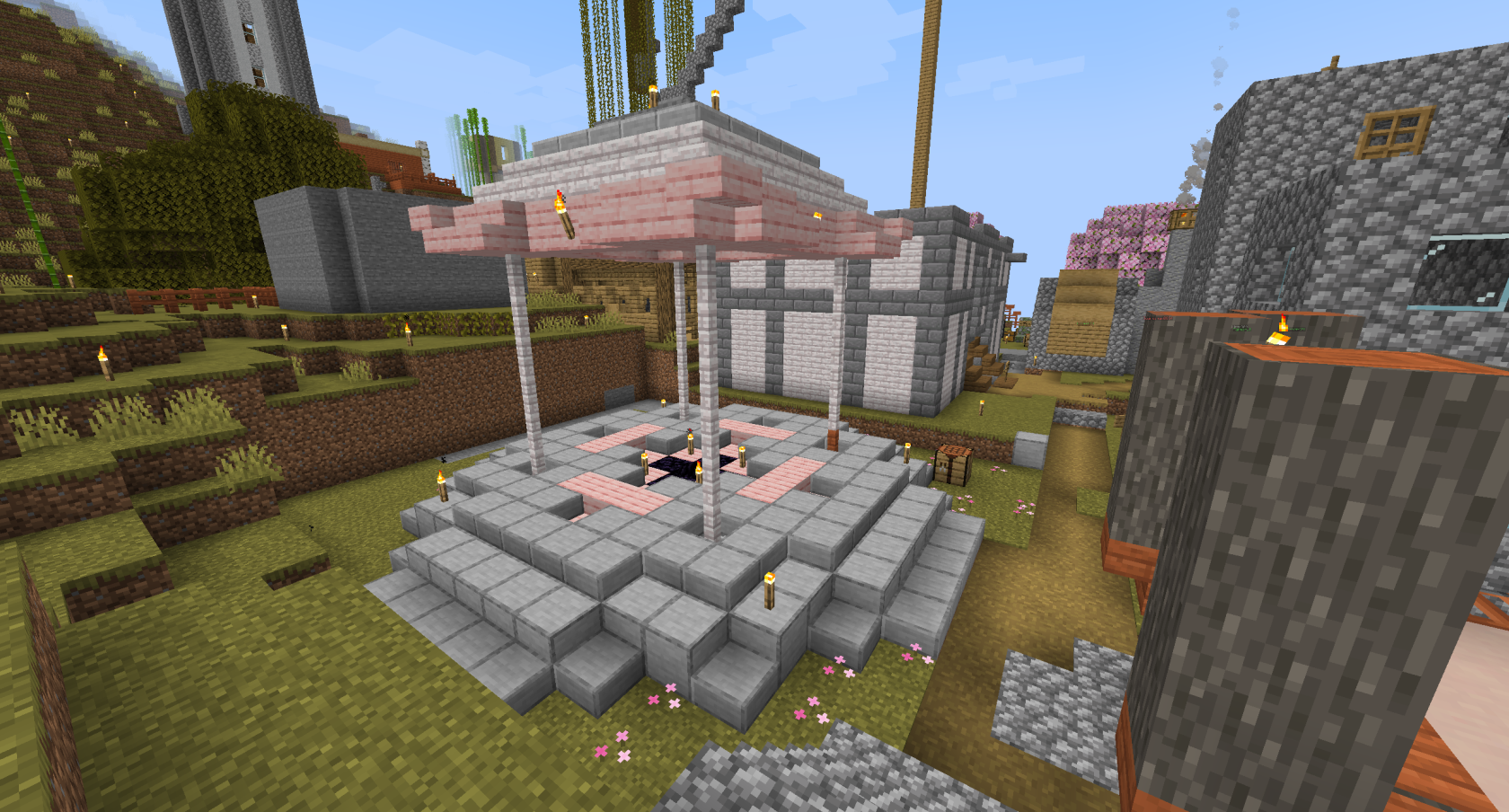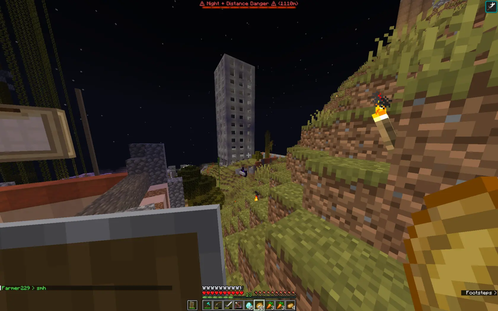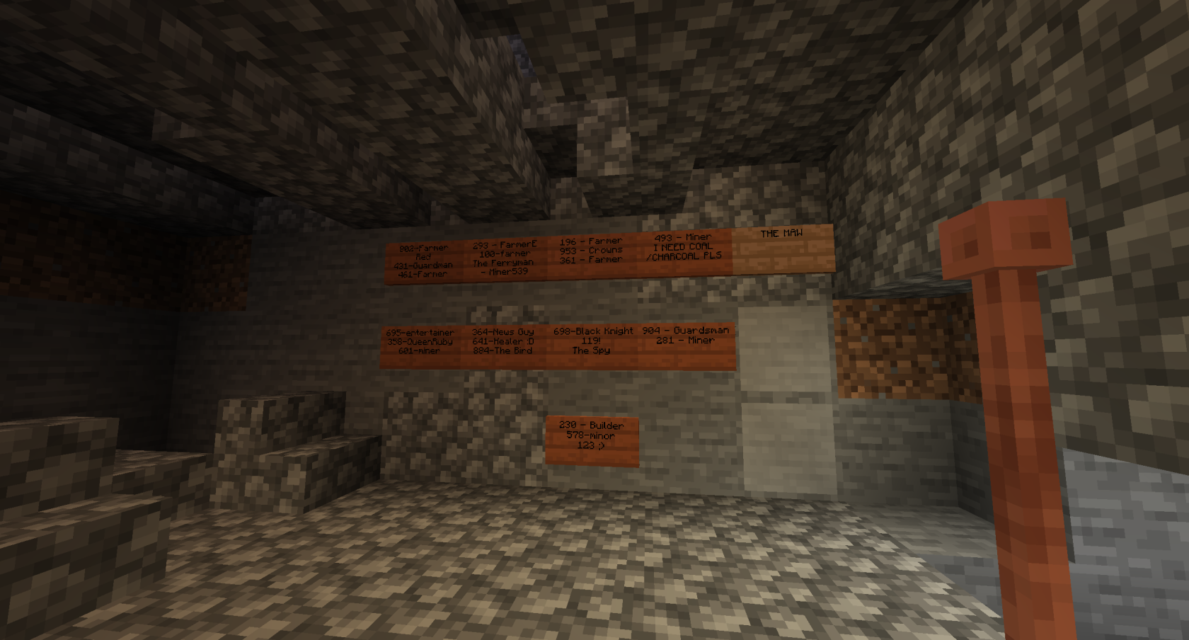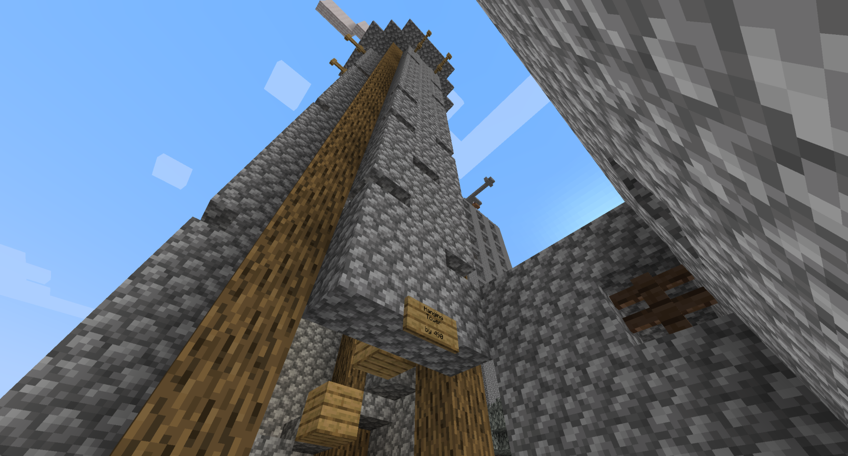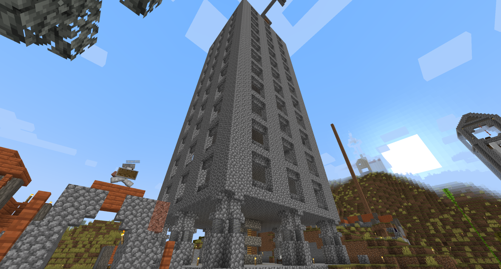 The below images show the Tower of Babel under construction. The project was ideated by Inquisition Phoenix, but designed and led by Architect with support from builds Pumpkin Head and Dwarf. It was enabled by the construction of the Quarry by the Farmers Guild, providing several double chests of cobblestone. Despite the chaos in Session 14, its defensive design proved worthy as it was able to successfully repel the invaders.