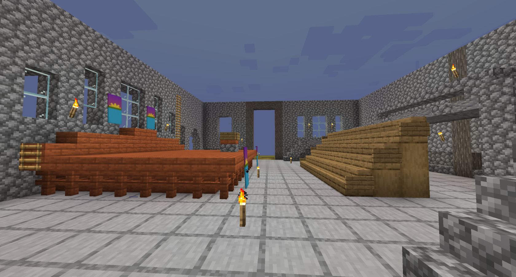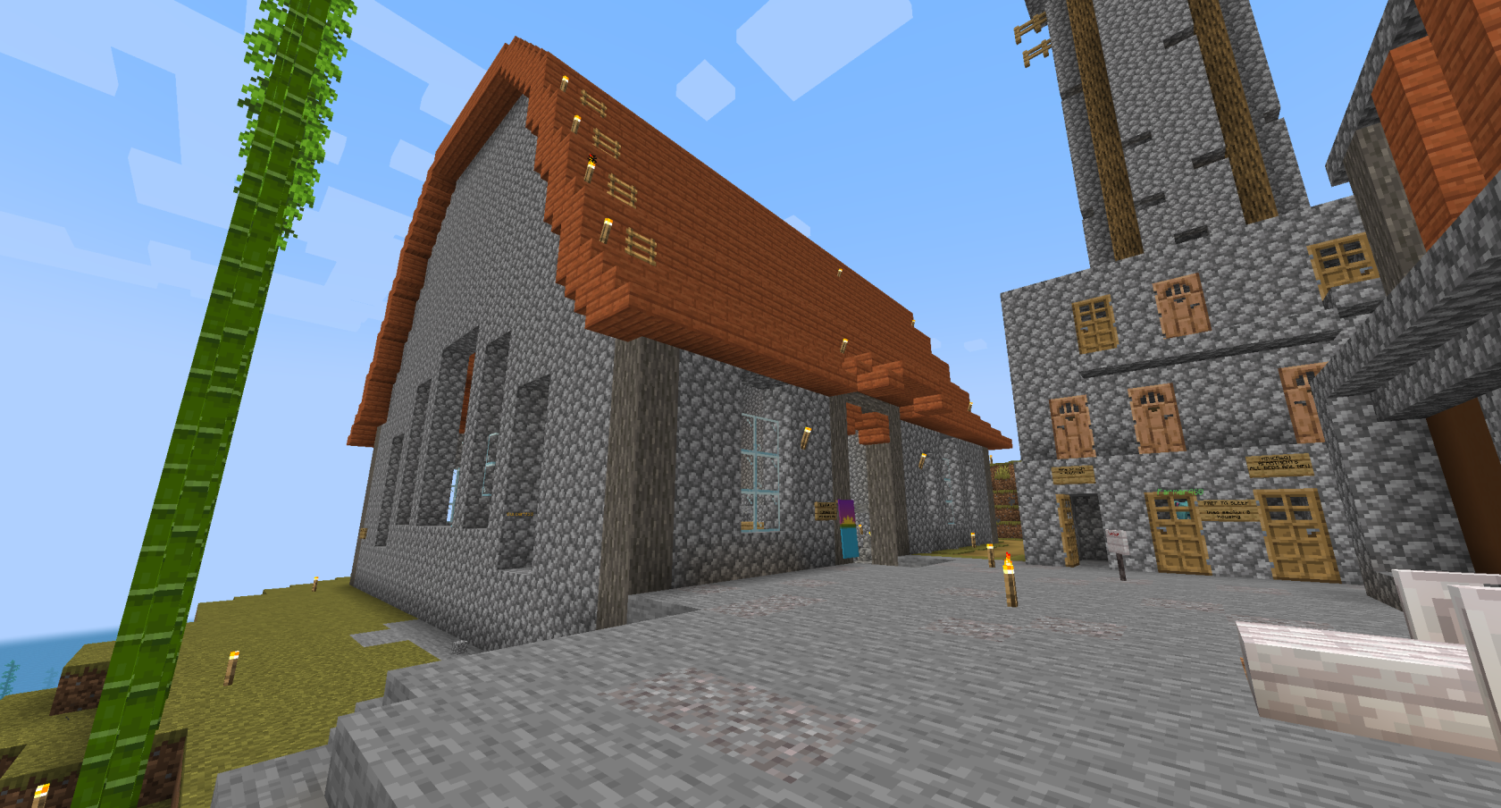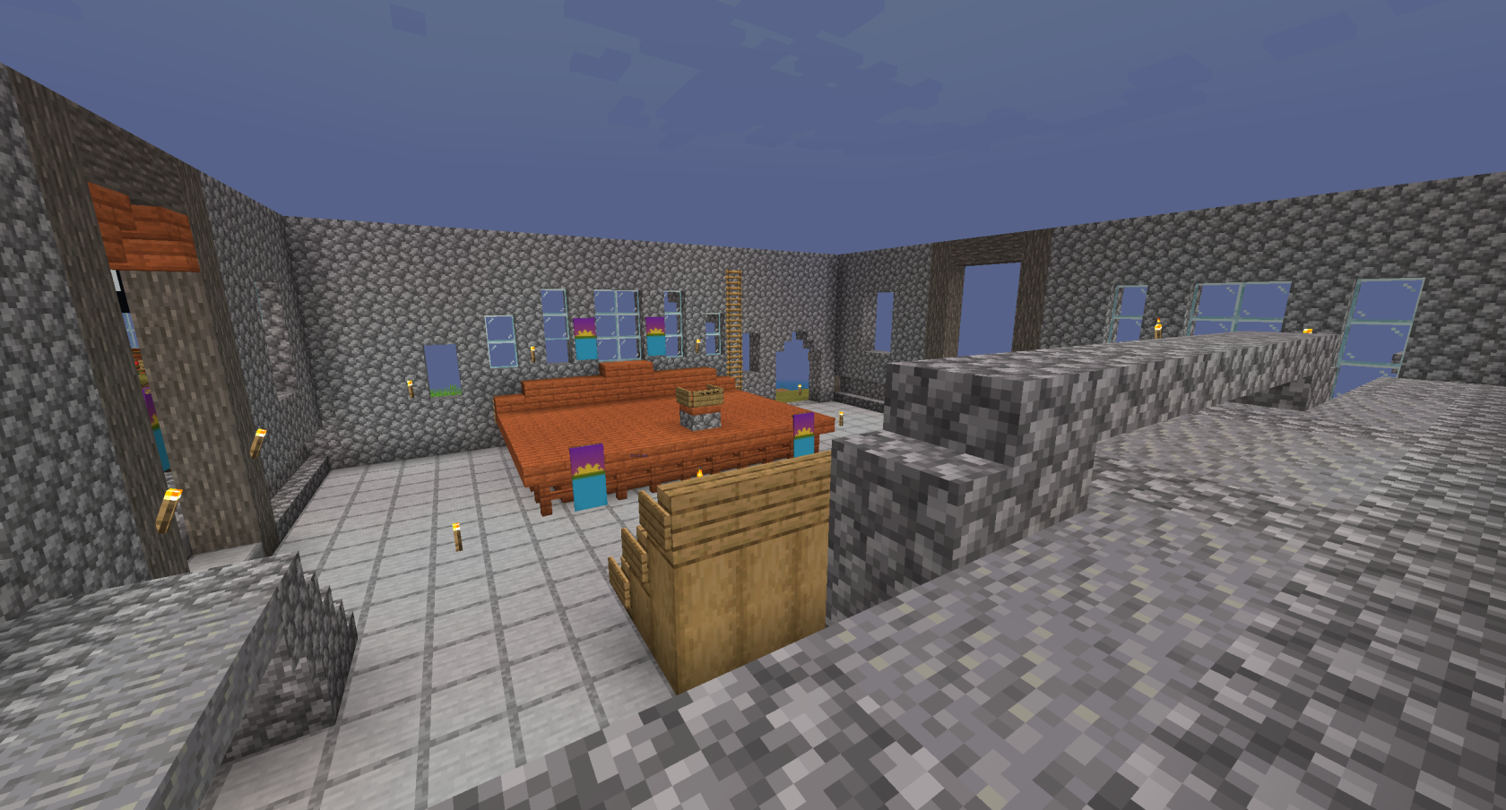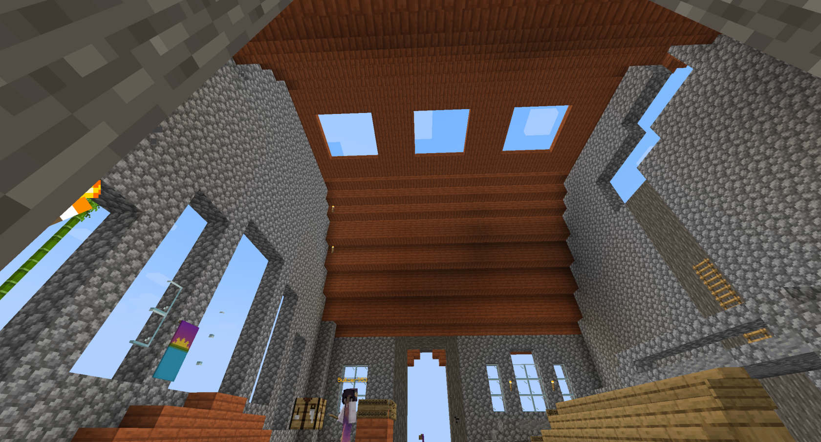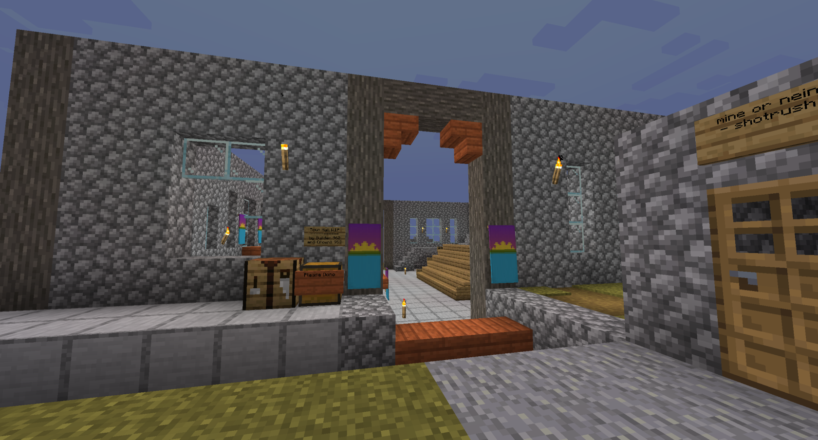 The below images show the partially-completed Town Hall that existed at the end of Session 6. This project was created by builders Crowns and Dwarf, however Crowns would continue to work on this project going forward, building the roof by herself.