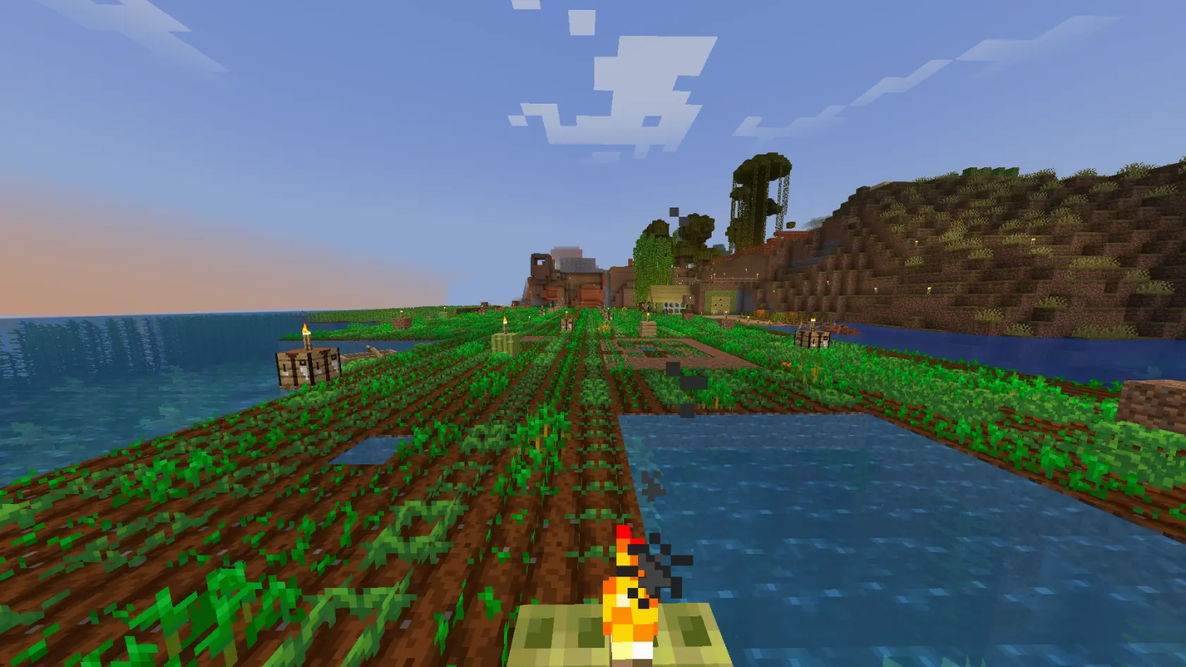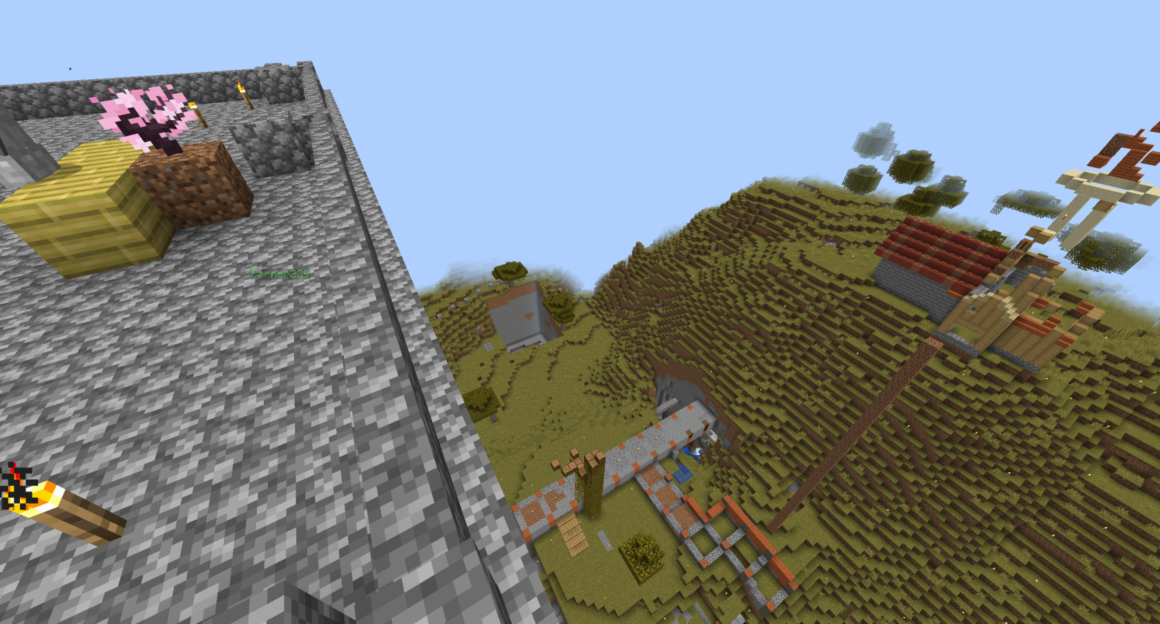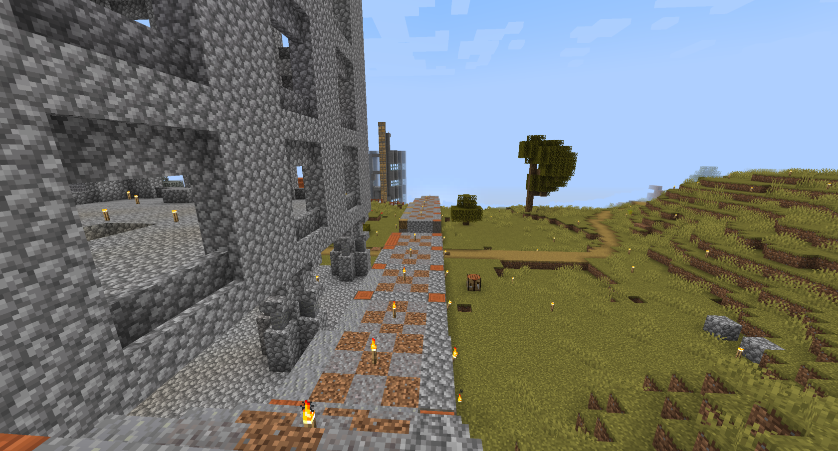 The below image is a view from the top of the Tower of Babel, but in distance the Second Quarry can be seen. The First Quarry was under two dozen blocks shy of being completed in Session 14, however the rapid advance of God's Barrier wiped out the population of the town and banned reentry, leaving the project technically unfinished.