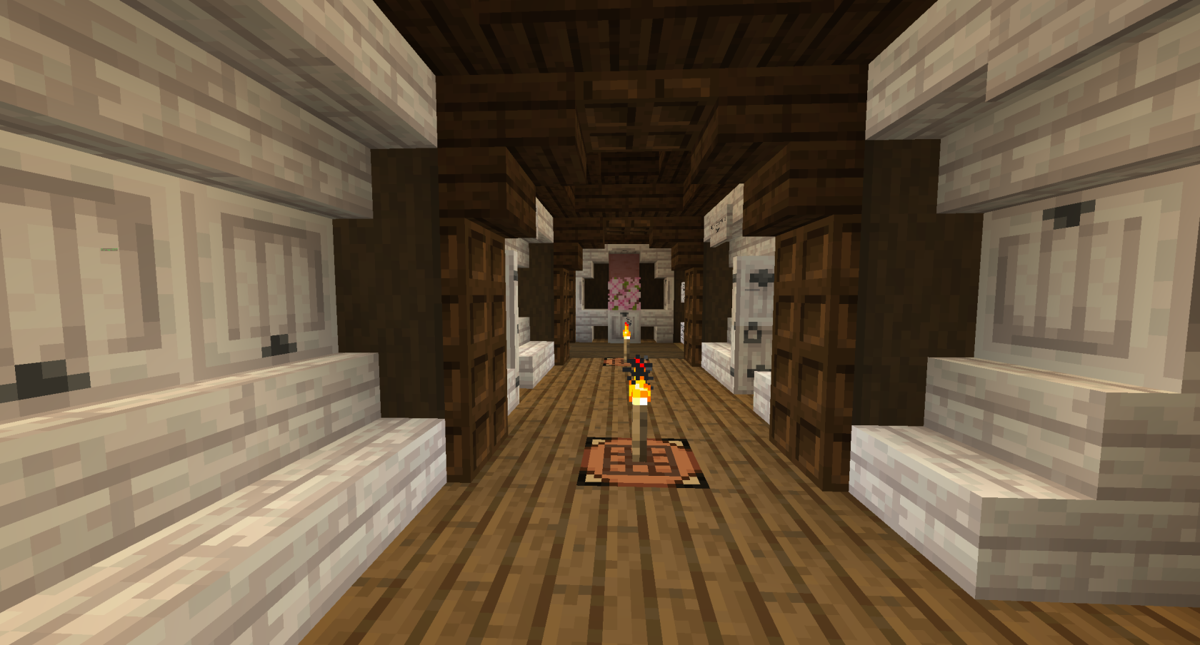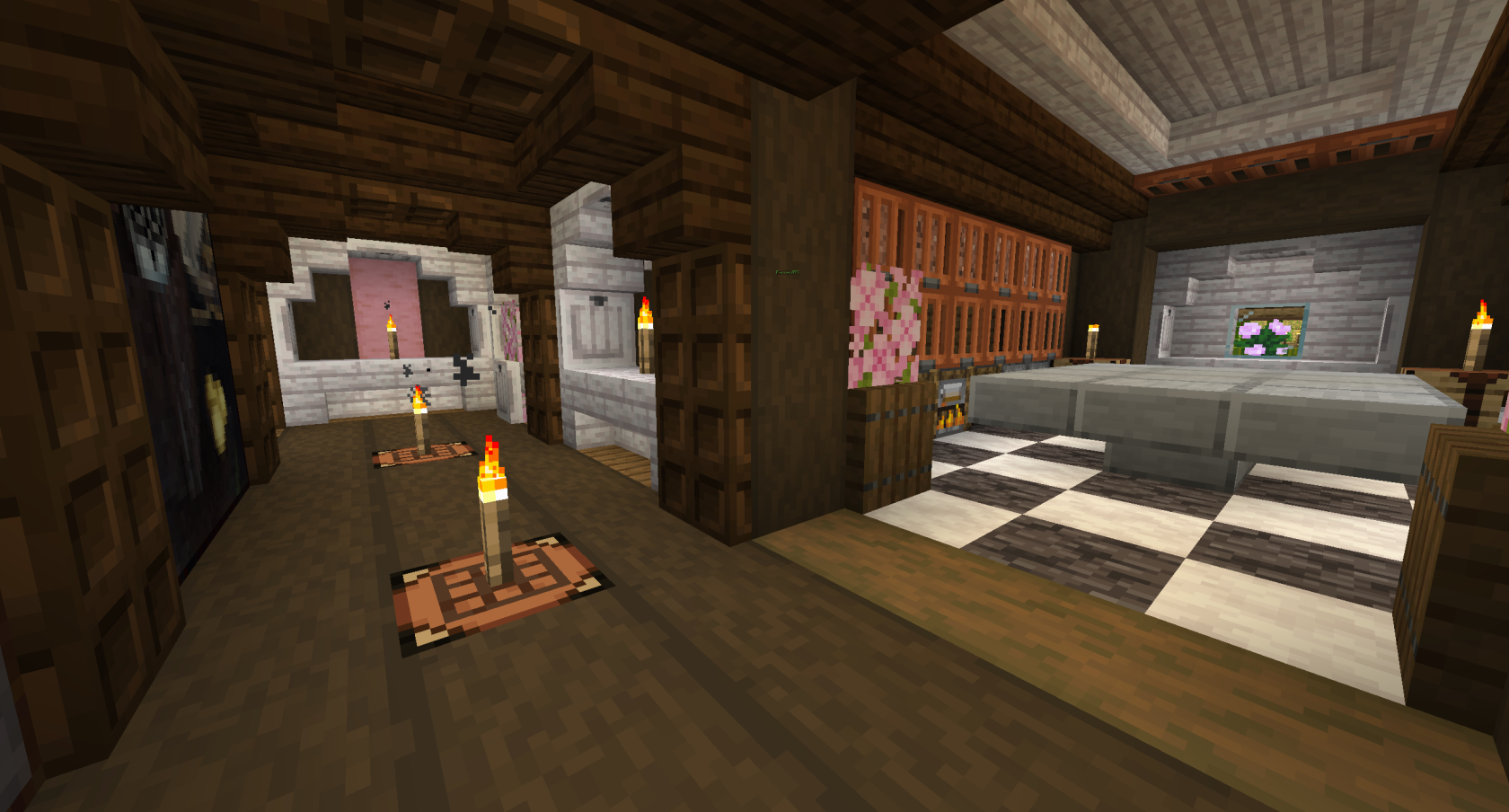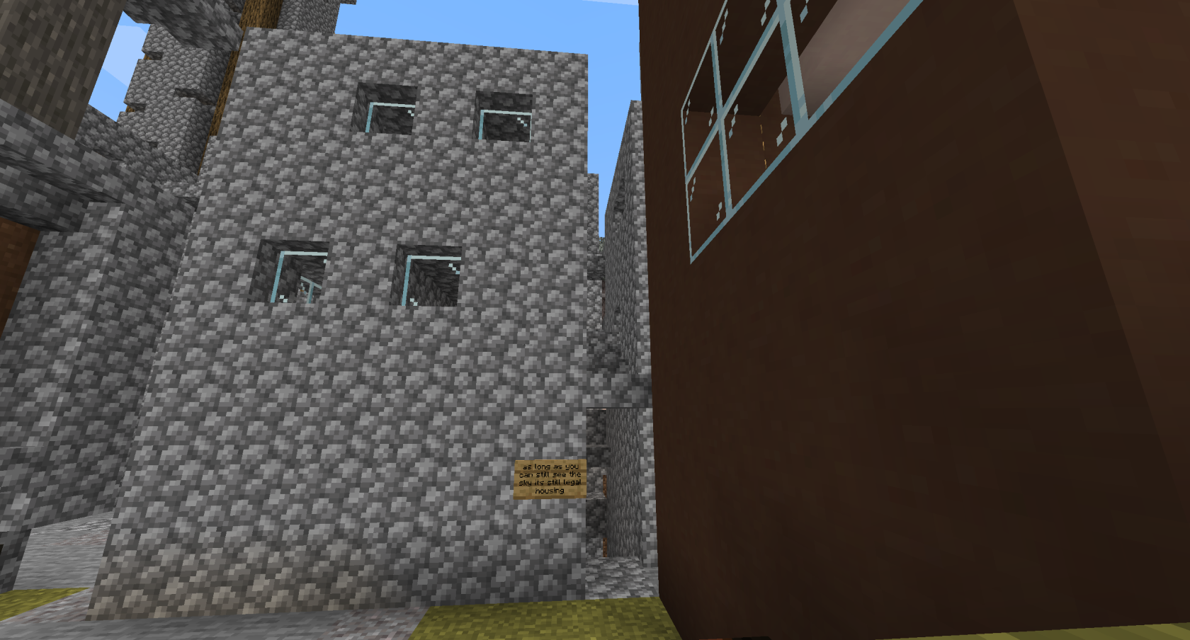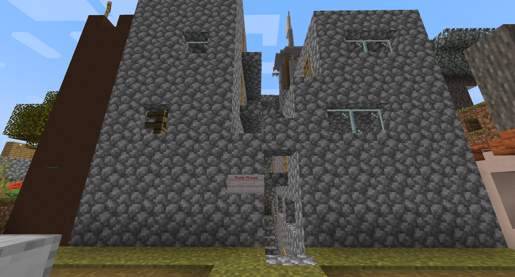 The below images show the new Tenements, also known as the Slums. These were originally 3 houses built with arson and griefing in mind by builder Dwarf, but were expanded on by 490. In Session 14 despite almost all beds and the rest of the Promised Land being destroyed, the Slums were completely untouched, including several beds hidden in their twisting alleys.