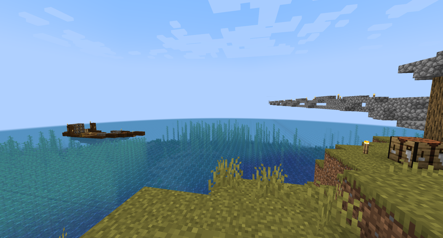 The below image shows a bridge constructed by 490 on the eastern shore, stretching towards Beachland and Ducklandia. A trading vessel is also passing through. The ship was constructed recently, but the bridge was an early project.