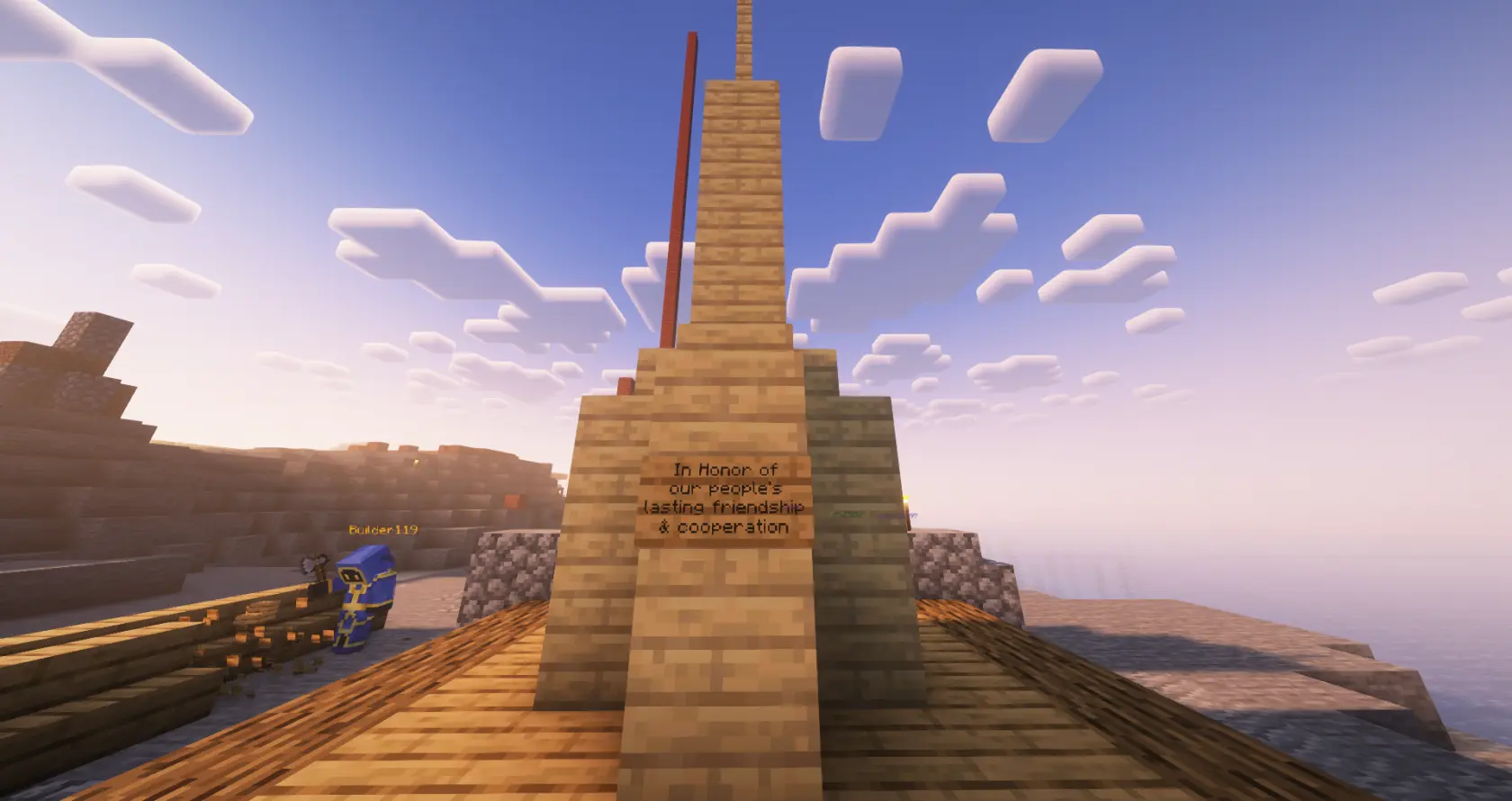 The below image shows the Monument of Unity between Beach Town and The Promised Land, built by Artchitect. It was intended to be a meeting place for the nations, however the opportunity never came as international tensions caused Beachtown to shut themselves off from the outside world.
