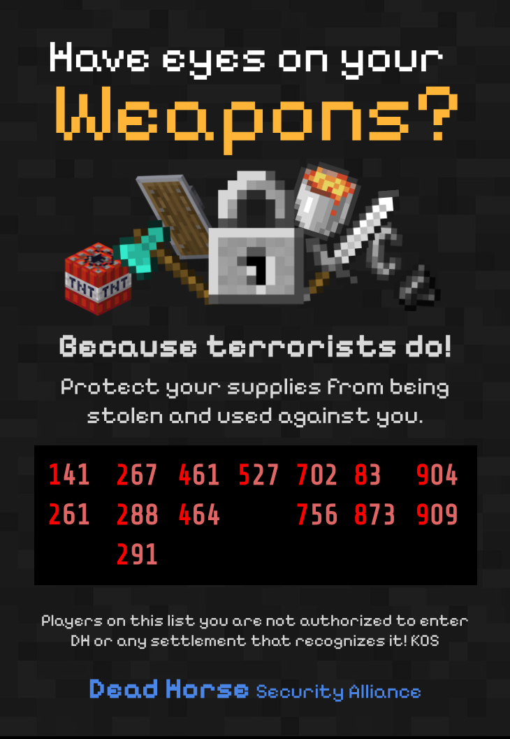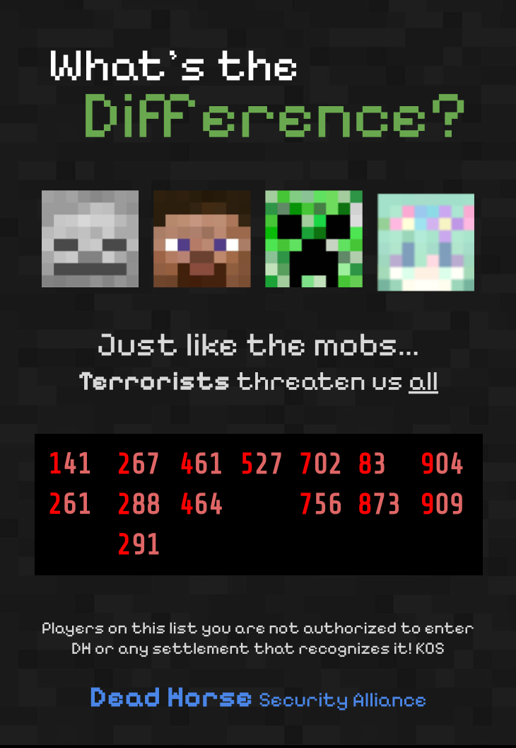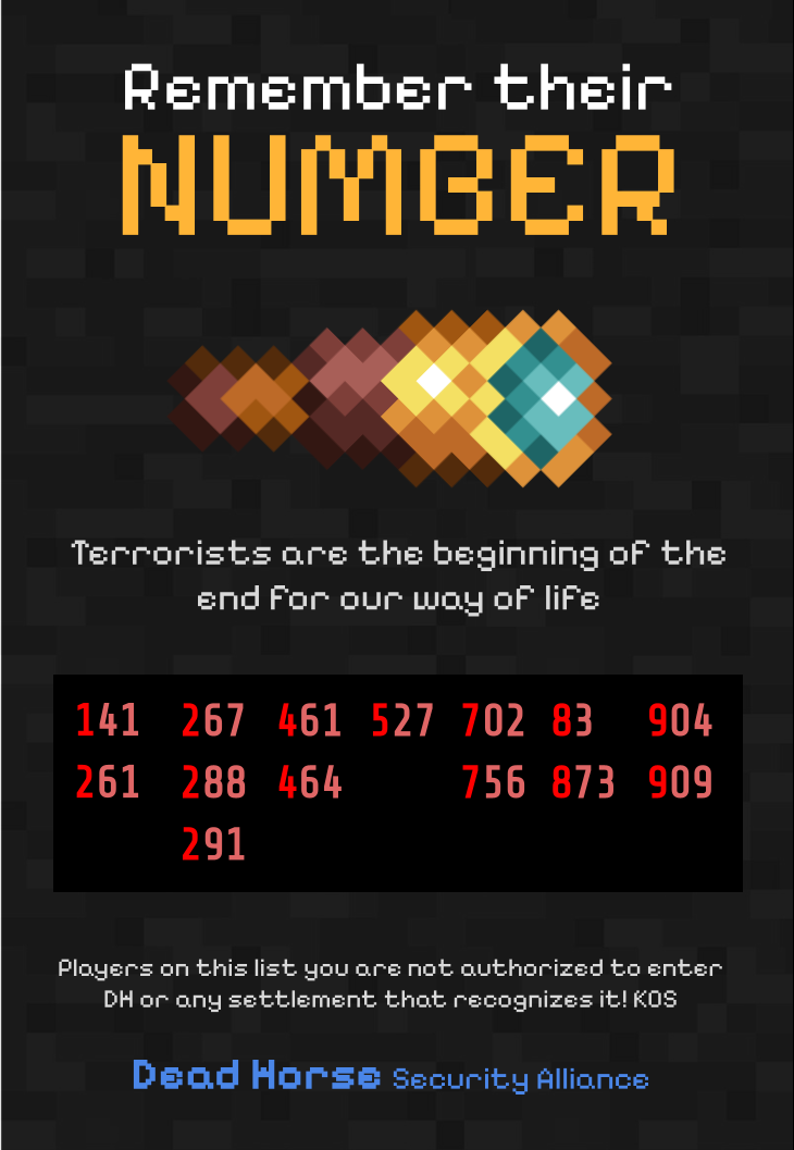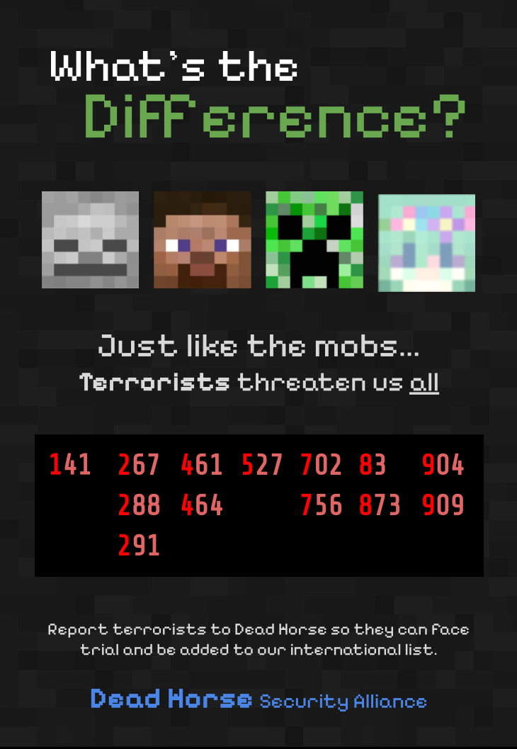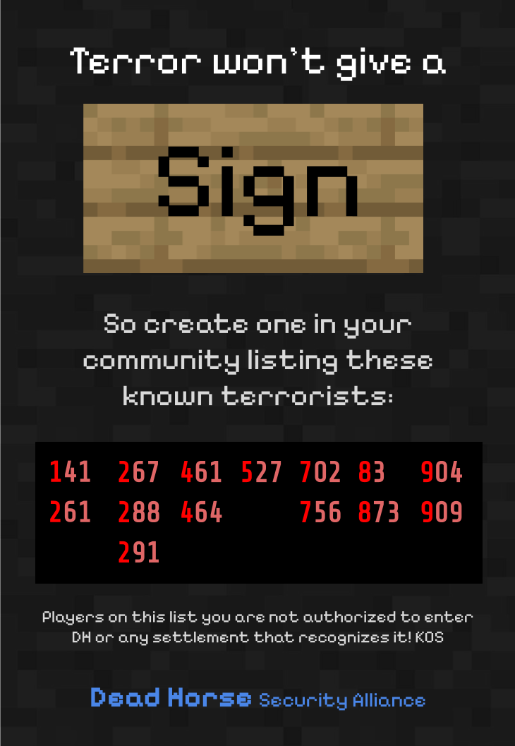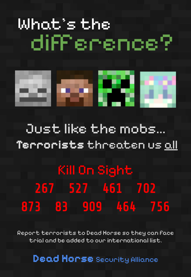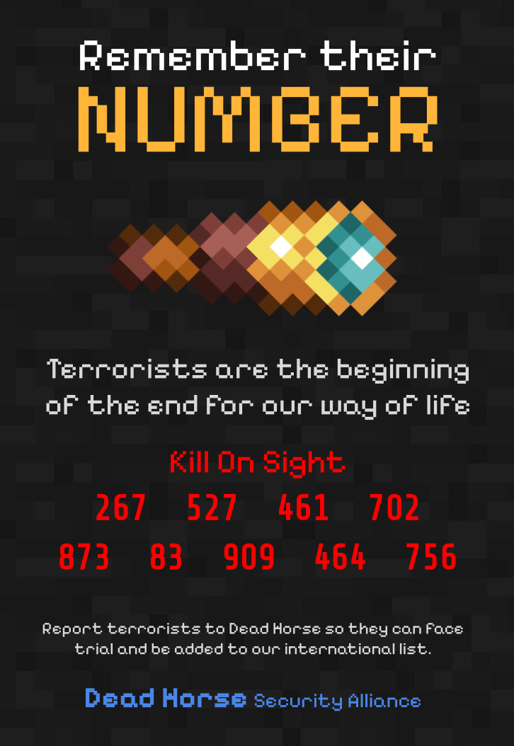 The Dead Horse Security Alliance, run by discord user Zayah, is an organization that publishes safety posters warning people of prominent terrorists during Trial 1 (particularly terrorists that attack dead horse). The list is updated frequently to include new terrorists.