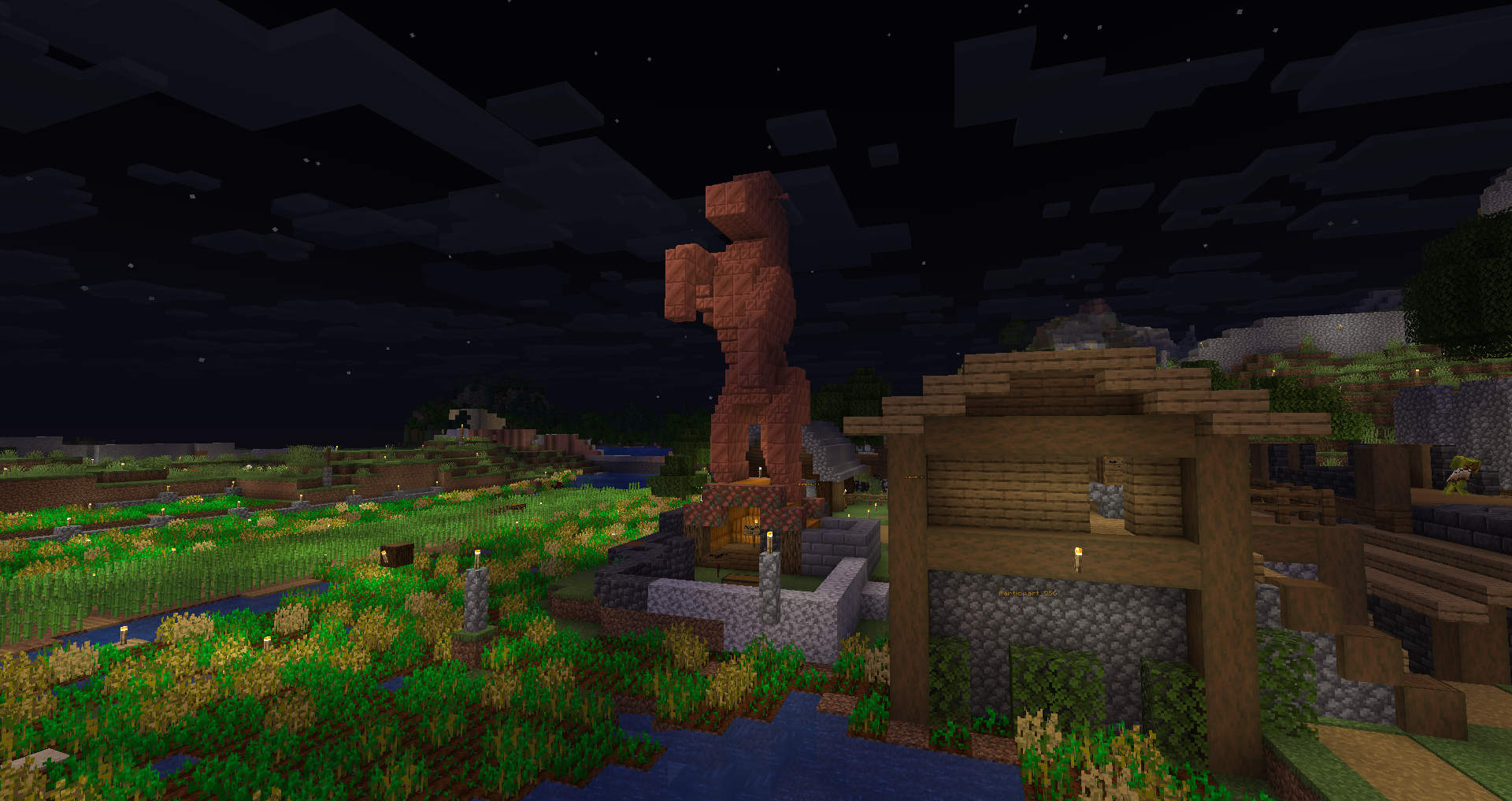 The sacred skeleton horse was kept in a shrine made of pumpkin and raw copper, the orange colors signifying the paradox of life and prosperity the undead creature brings. Additionally, a small skeleton horse monument, made by Player 12, was created off the side of the western mountains, made with cobblestone and amethyst eyes.