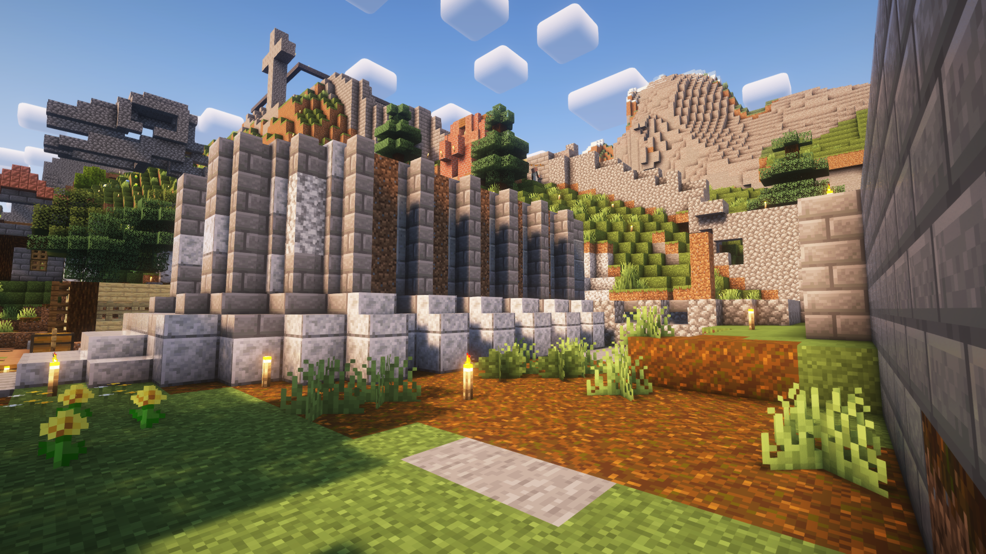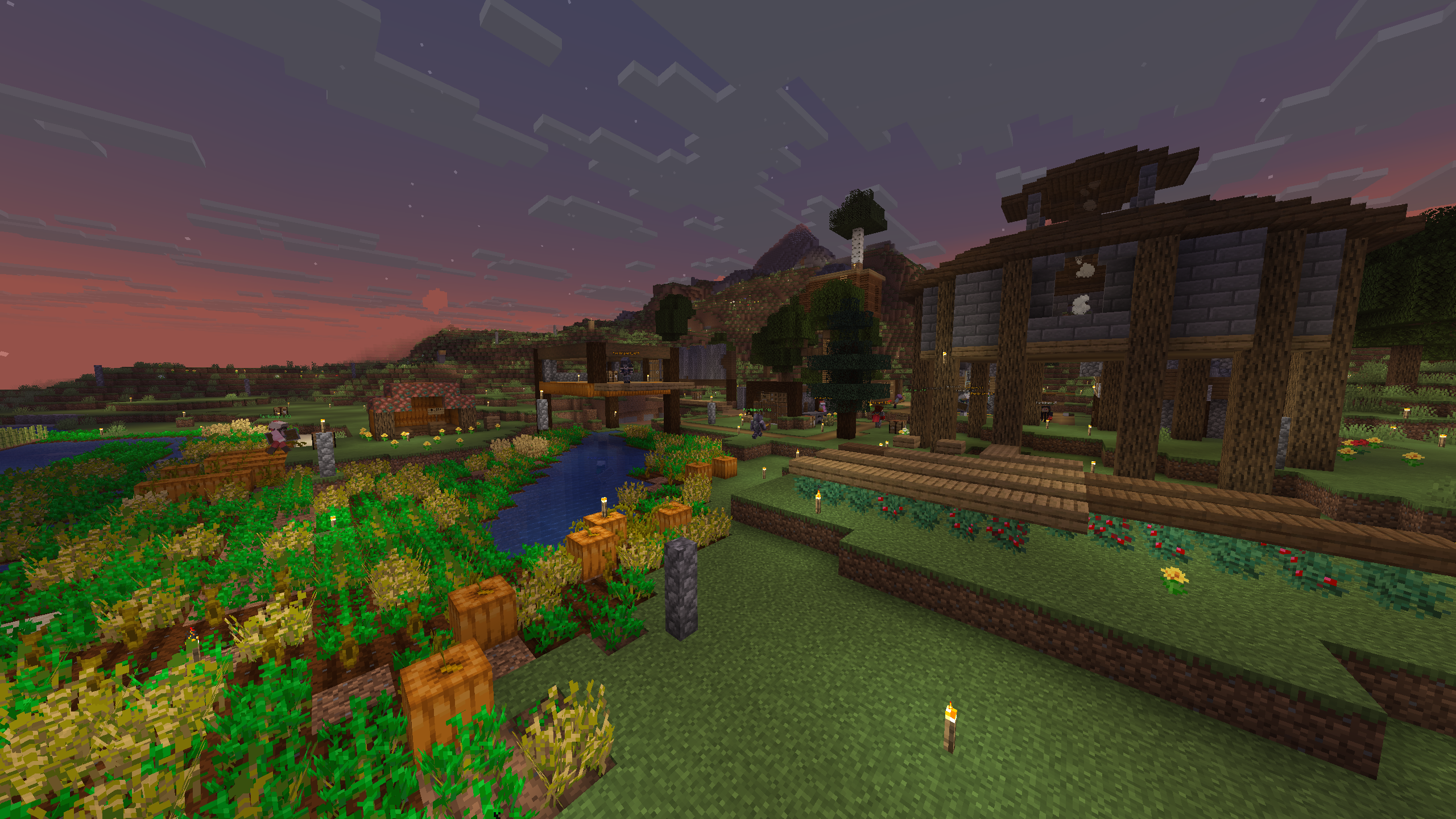 A view of Dead Horse in session 2, including the incomplete council hall, fishing shelter, farmland, and Dead Horse Shrine