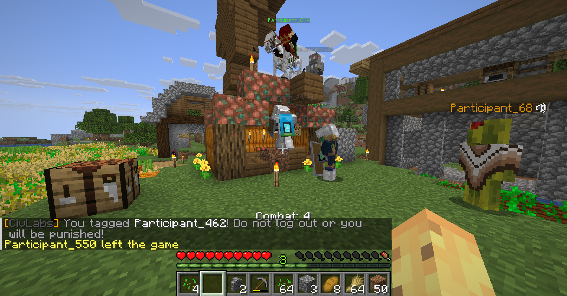 864 initially took part in the group that became Capital Hill, having spawned on the island that made up the nation during Session 1. He was one of the first to start collecting kelp as a food source during the initial overcrowding of the island, and is anecdotally the first person to call the island "Taiwan" (though this name was only used briefly and unofficially in the first few sessions). At a certain point, having grown rapidly tired of trying to supply Capital Hill with food while himself starving, he migrated to the Berrywood Commune where he quickly started gaining levels as a farmer. An attempt to switch his profession to guardsman ended after he was repeatedly killed by mobs (and had his levels reset) while trying to farm XP. During this time in Session 1 he also first encountered Player 462 "the Jester," who he immediately disliked and would kill or chase while laughing maniacally. This was common practice at the time, as the Jester was seen as a petty nuisance who was only trying to cause trouble.